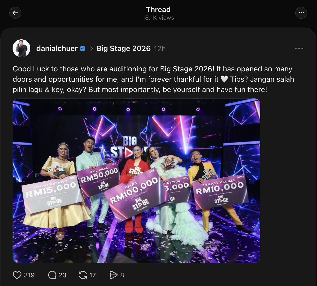 “Semoga berjaya kepada semua yang akan menghadiri uji bakat Big Stage 2026! Program ini telah membuka banyak pintu dan peluang untuk saya, dan saya sangat bersyukur dengannya,” tulisnya.