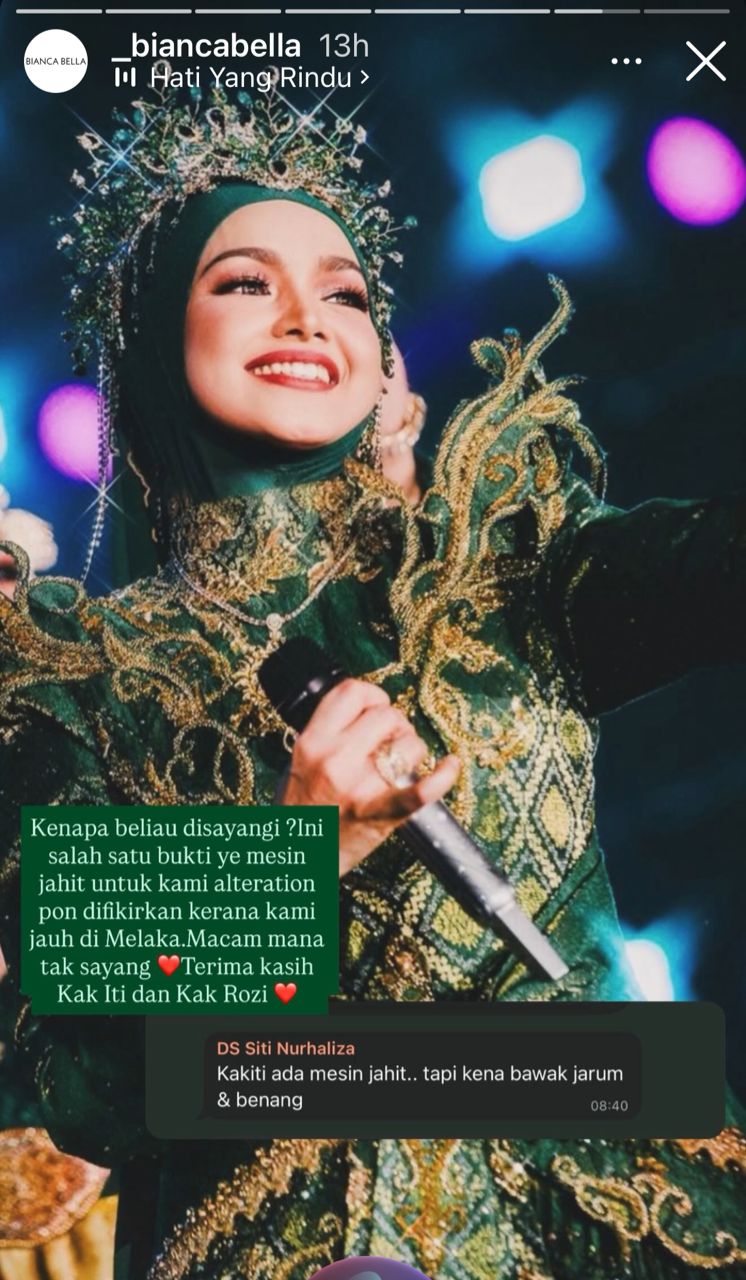 “Tak mudah seorang Biduanita Negara sanggup bawa mesin jahit sendiri ke belakang pentas. Itulah sebabnya beliau disayangi semua,” katanya yang kagum dengan siikap merendah diri Siti Nurhaliza sepanjang berkerjasama dan ia turut dikongsikan dalam hantaran Instagram story akaun Bianca Bella.