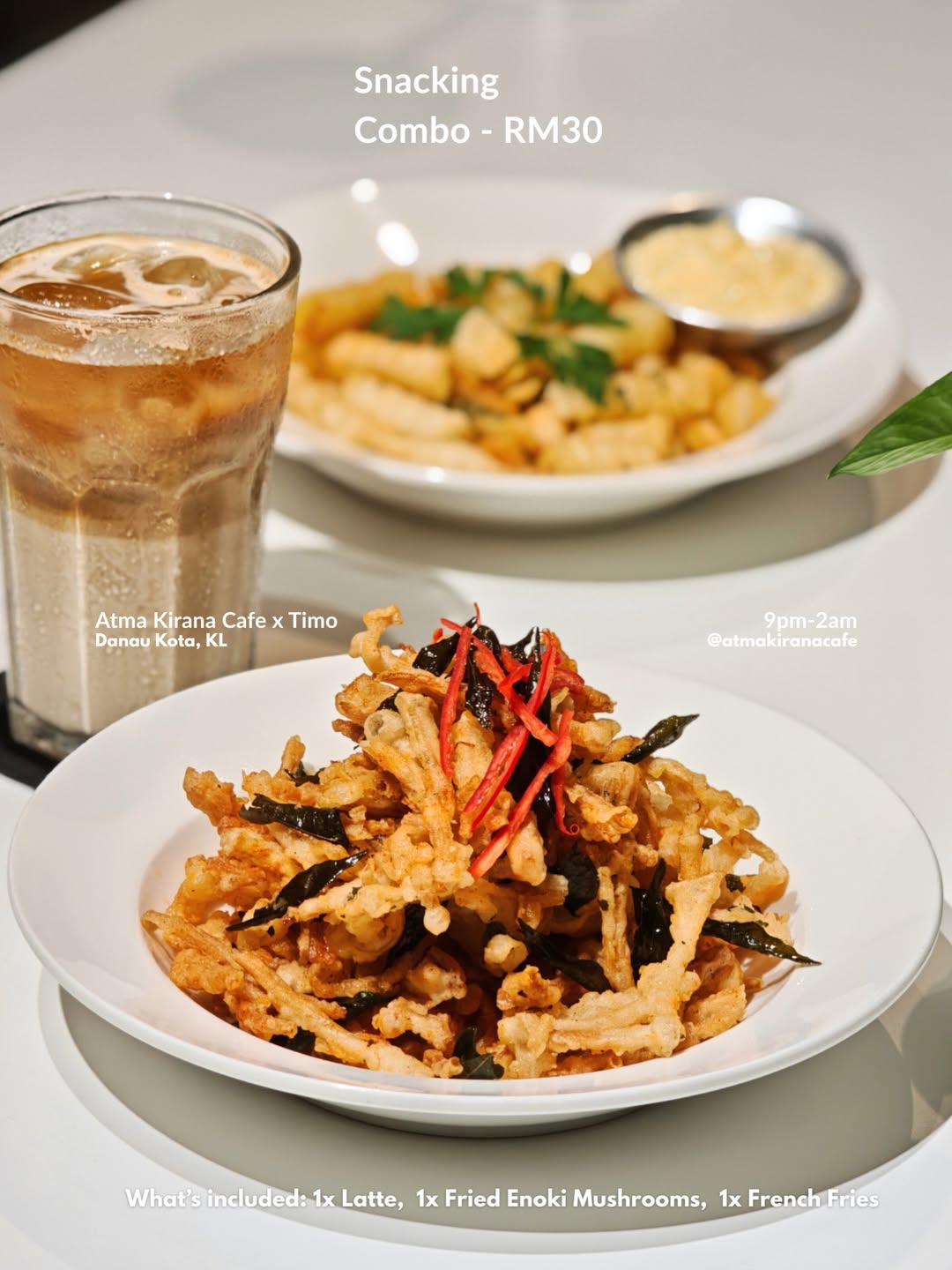 Throughout Ramadan, the café stays open until 2 AM daily—except Mondays when it is closed. Exclusively for the month, Atma Kirana is offering a Snacking Combo for RM30, which includes one Latte, one serving of Fried Enoki Mushrooms, and one serving of Fries. It’s a great option for those looking for light bites with their caffeine fix.