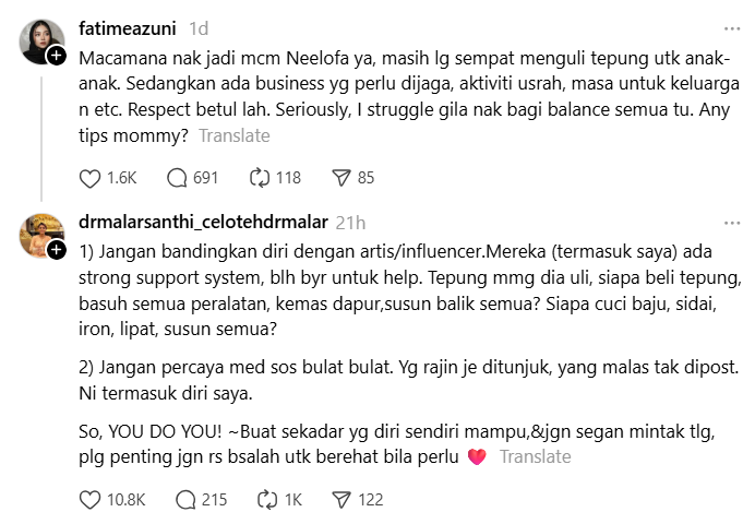 “Jangan bandingkan diri dengan artis atau influencer. Mereka termasuk saya ada strong support system dan boleh bayar untuk help. Tepung memang dia uli, tapi siapa beli tepung, basuh semua peralatan, kemas dapur, susun balik semua? Siapa cuci baju, sidai, iron, lipat, susun semua?” tulisnya.