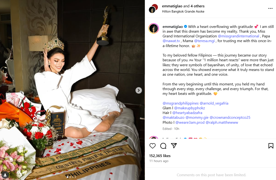 Ratu cantik Filipina, Emma Mary Tiglao, mencipta sejarah apabila diumumkan sebagai pemenang Miss Grand International 2025 yang berlangsung di Bangkok, Thailand baru-baru ini.