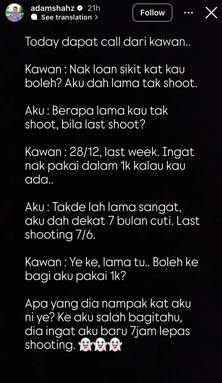 - Adam Shahz berkongsi perbualannya dengan seorang rakan yang mahu meminjam RM1,000 kerana sudah lama tidak terlibat dengan penggambaran.