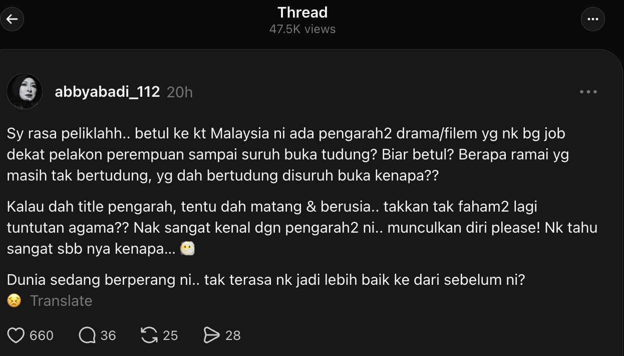 “Saya rasa peliklah, betul ke kat Malaysia ni ada pengarah drama atau filem yang nak bagi job dekat pelakon perempuan sampai suruh buka tudung?
