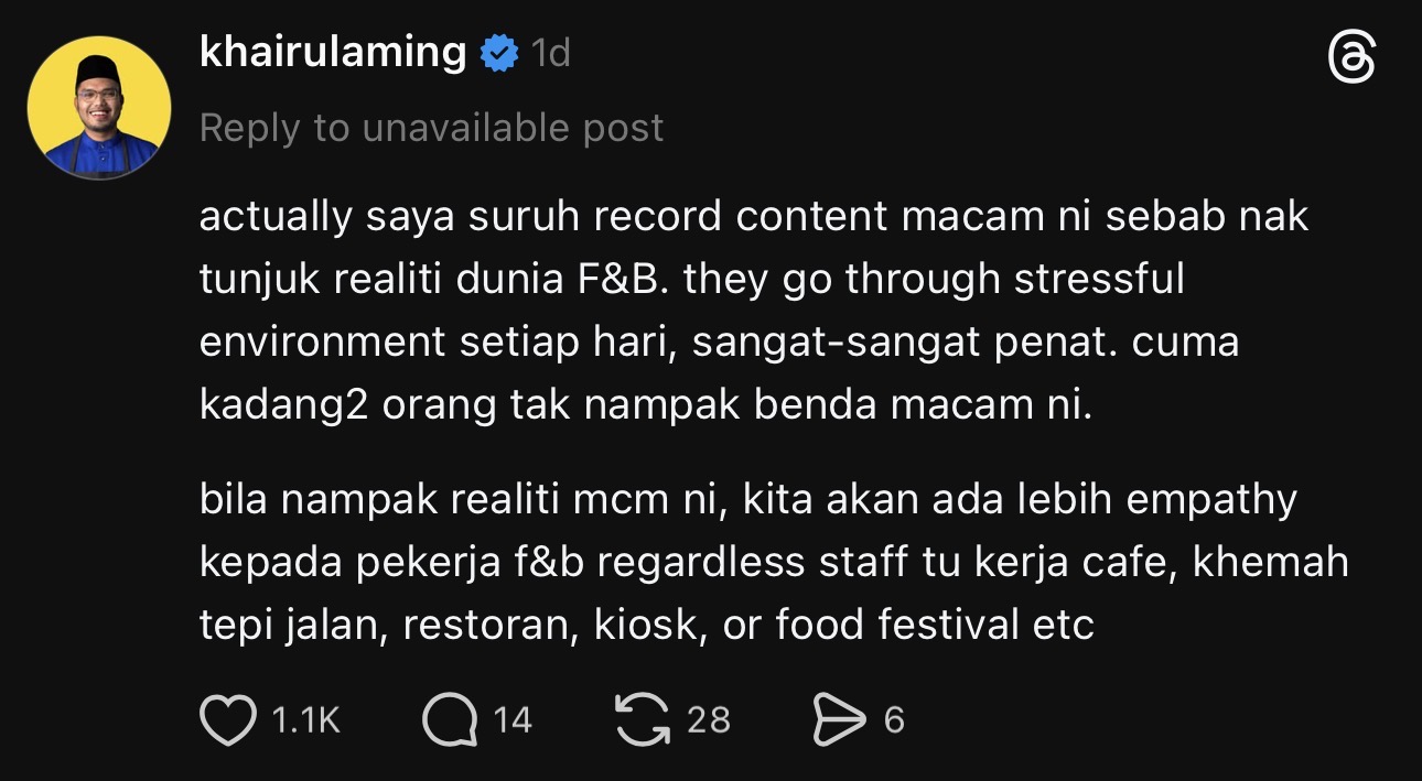 Menerusi perkongsian di platform Threads, Khairul Aming memaklumkan rakaman tersebut bukan sekadar kandungan semata-mata, sebaliknya bertujuan memberi gambaran sebenar mengenai cabaran yang dihadapi dalam industri makanan dan minuman (F&B).
