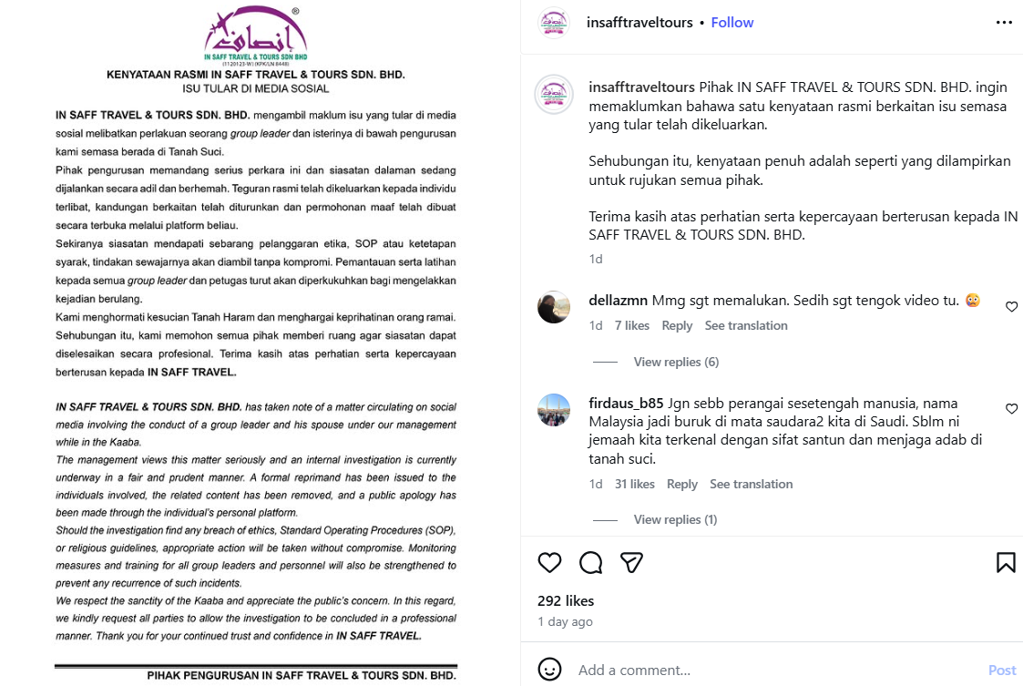 Pengurusan agensi umrah In Saff Travel & Tours Sdn. Bhd. tampil memberikan penjelasan susulan isu melibatkan tingkah laku seorang ketua rombongan bersama isterinya ketika menunaikan ibadah di Tanah Suci baru-baru ini.