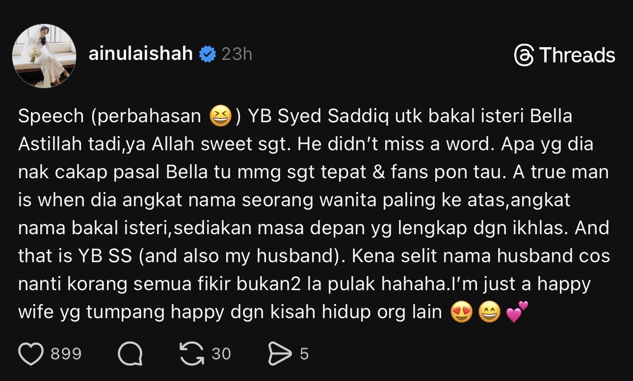 “Speech (perbahasan) YB Syed Saddiq untuk bakal isteri Bella Astillah tadi. Ya Allah sweet sangat. He didn’t miss a word.