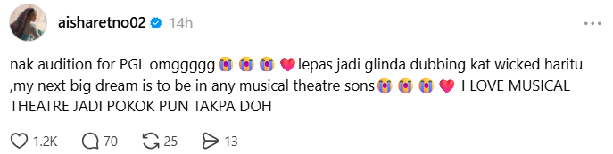 “Nak audition for PGL omg. Lepas jadi Glinda dubbing kat wicked haritu, my next big dream is to be in any musical theatre sons. I LOVE MUSICAL THEATRE JADI POKOK PUN TAKPA DOH,” tulisnya.
