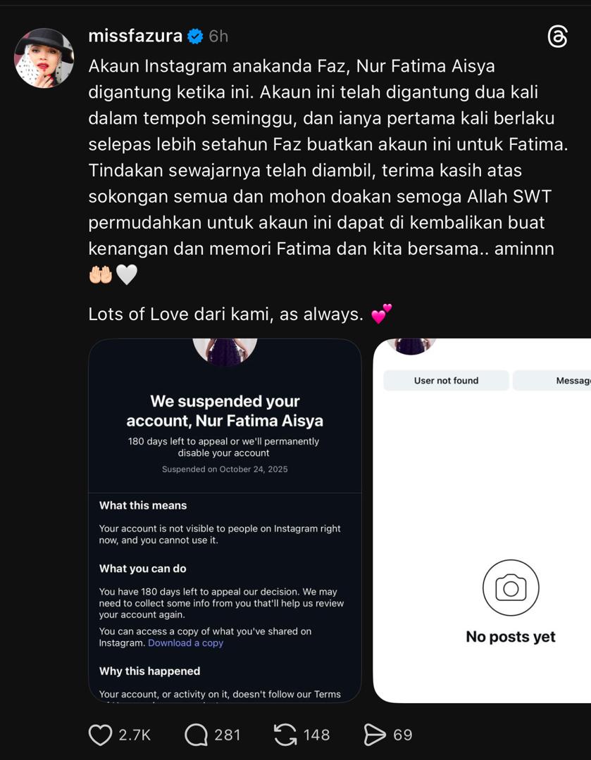 “Akaun Instagram anakanda Faz, Nur Fatima Aisya digantung ketika ini. Akaun ini telah digantung dua kali dalam tempoh seminggu, dan ianya pertama kali berlaku selepas lebih setahun Faz buatkan akaun ini untuk Fatima,” maklumnya.