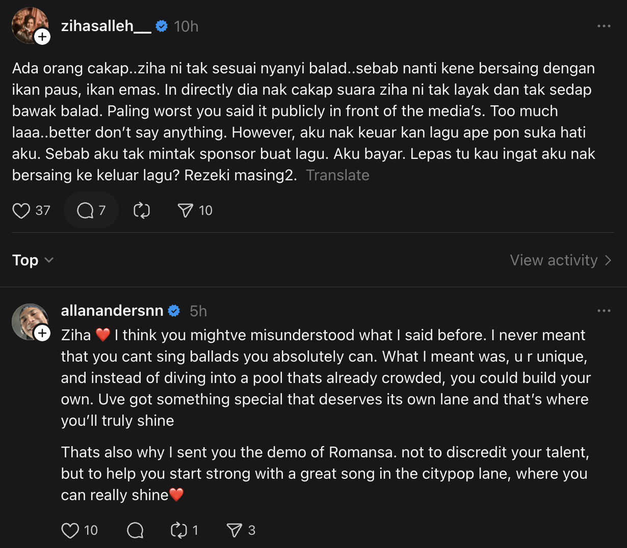 Menerusi satu hantaran di Threads, Allan menjelaskan kenyataannya itu telah disalah tafsir dan menjelaskan maksud sebenar di sebalik pandangannya terhadap hala tuju muzik Ziha.