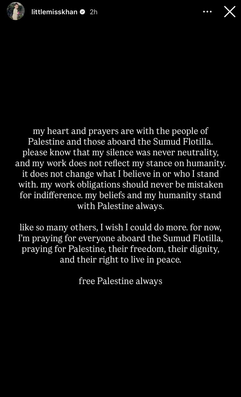 “Kepercayaan dan sisi kemanusiaan saya sentiasa bersama Palestin,” katanya menerusi satu hantaran dalam InstaStory pada Sabtu.