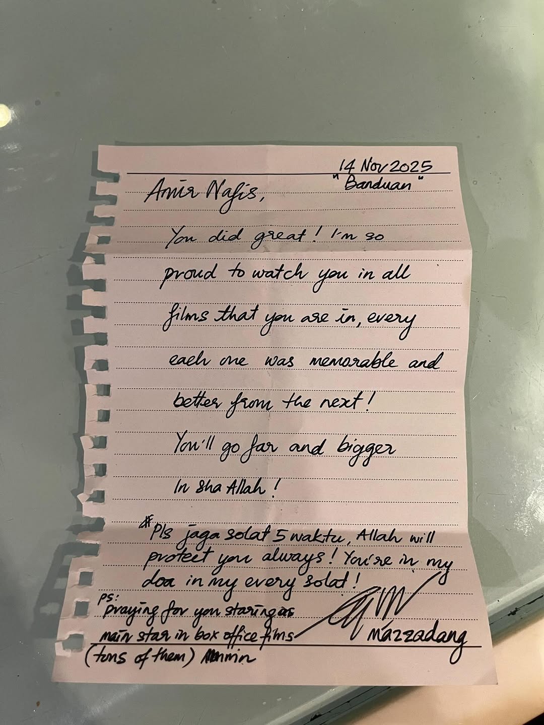 - Amir menerima surat daripada seorang peminat yang menonton filem lakonannya, Banduan, yang mula ditayangkan pada 6 November lalu.