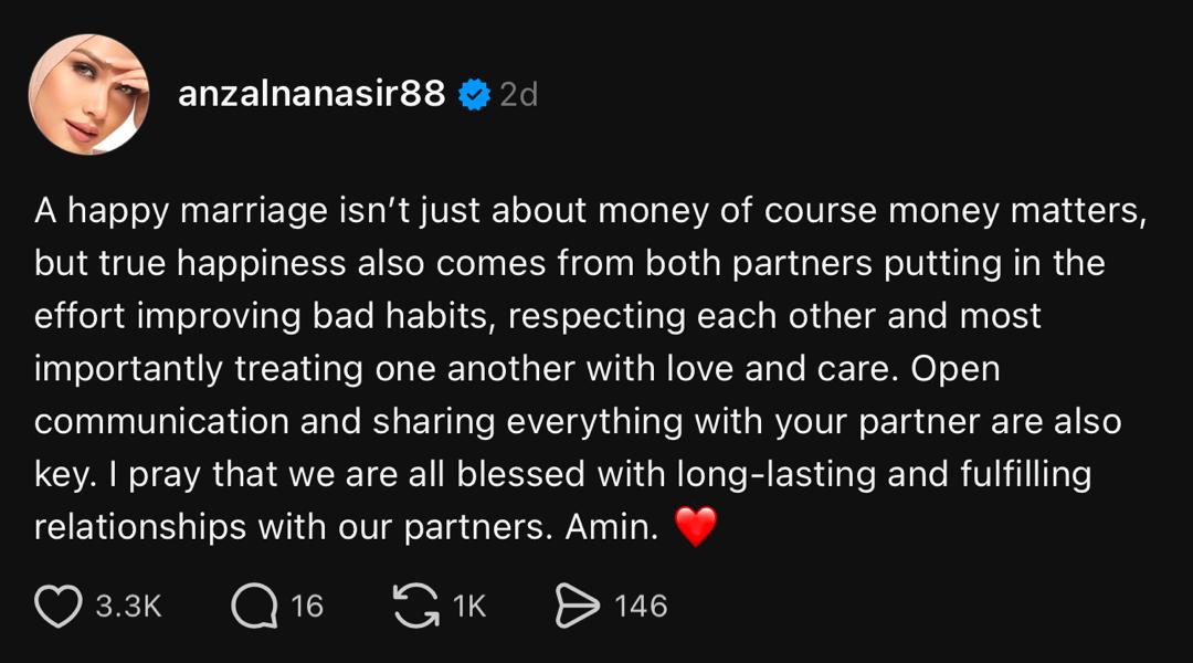 - Anzalna Nasir percaya kebahagiaan rumah tangga bukan hanya bergantung pada kestabilan kewangan.