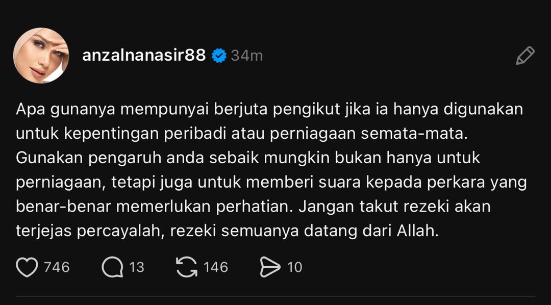Pelakon, Anzalna Nasir menyeru agar para selebriti dan individu berpengaruh di media sosial menggunakan platform mereka untuk tujuan yang lebih bermakna.