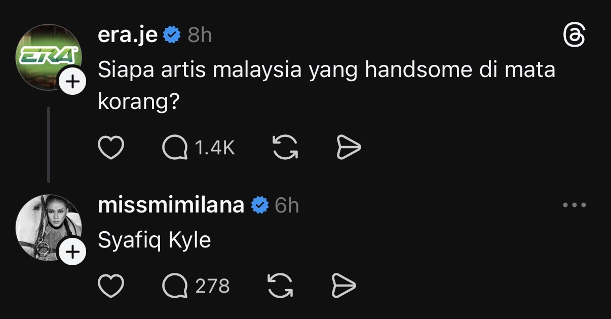 - Mimi Lana pilih suaminya, Syafiq Kyle, sebagai pelakon Malaysia paling kacak menerusi komen di ciapan Threads Era.