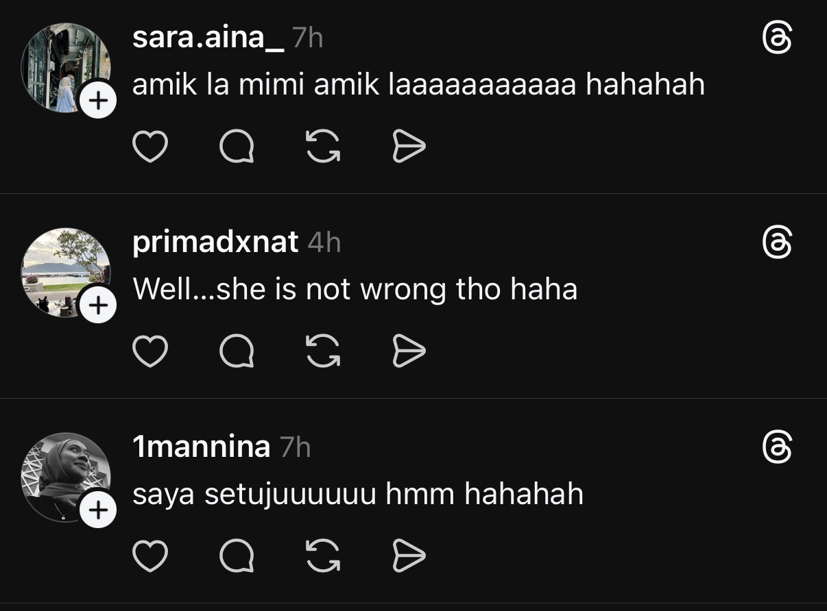Perkara itu dikongsikan Mimi atau nama sebenarnya Mimi Rozaiana Zainal Abidin menerusi ruangan komen ciapan Threads yang dibuat stesen radio, Era.