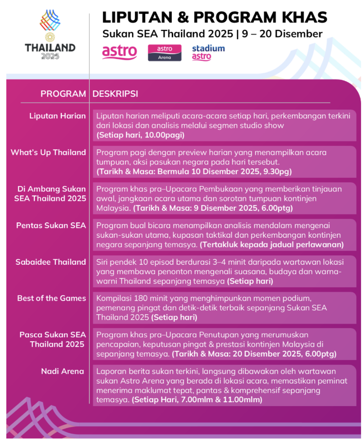 Untuk maklumat lanjut mengenai liputan Sukan SEA Thailand 2025, peminat boleh mengikuti laman sosial rasmi Astro Arena di facebook.com/AstroArenaSaluran801, www.instagram.com/astroarenahd atau layari stadiumastro.com/.