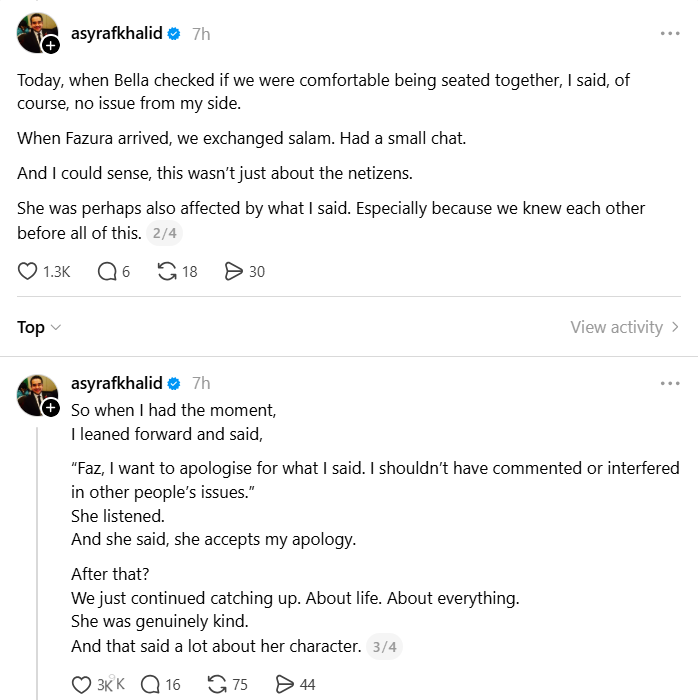 Menerusi beberapa perkongsian di Threads, Asyraf berkongsi detik pertemuan mereka yang berlangsung dalam suasana tenang dan matang.