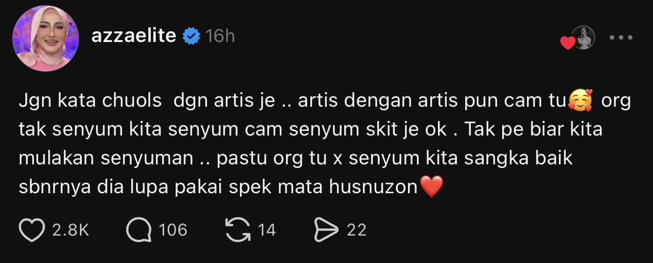 Azza berkata demikian sebagai respon kepada hantaran seorang individu yang telah mencetuskan perbincangan di Threads apabila bertanyakan soalan mengenai artis Malaysia yang pernah ditemui dan disifatkan sebagai bersikap sombong.