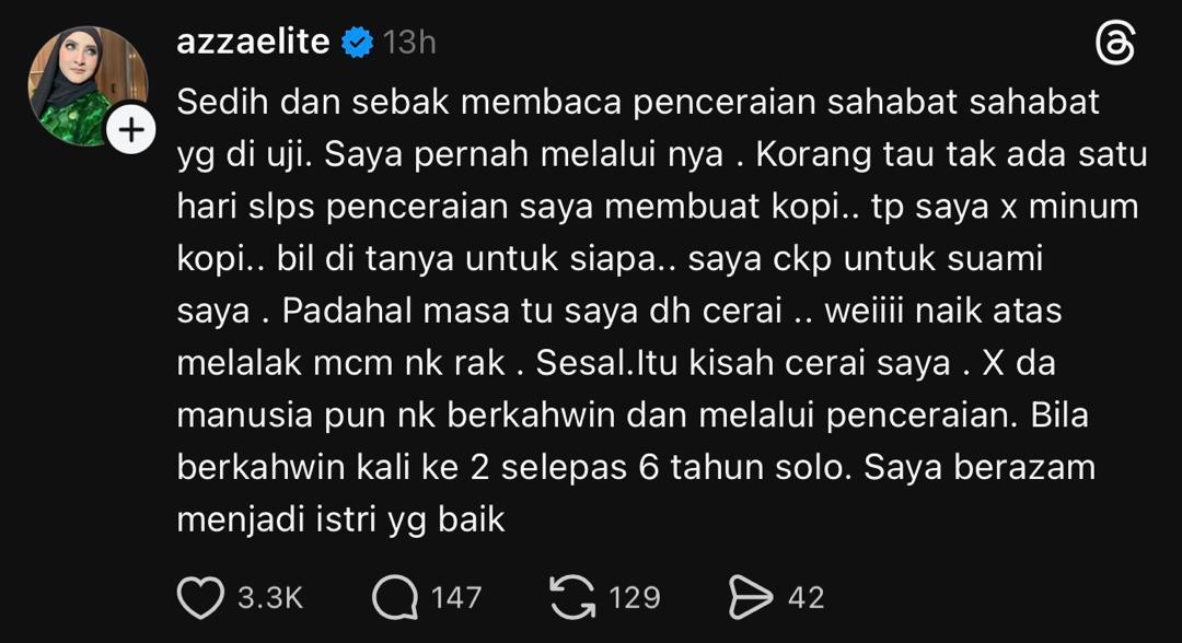 Menerusi perkongsian di platform Threads, Azza turut mengimbau kisah peribadi ketika melalui episod penceraian yang merupakan satu fasa cukup mencabar dalam hidupnya.