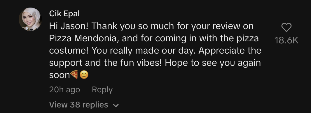 “Hai Jason! Terima kasih banyak atas ulasan mengenai Pizza Mendonia, dan kerana datang dengan kostum pizza! Awaken memang menggembirakan hari kami.