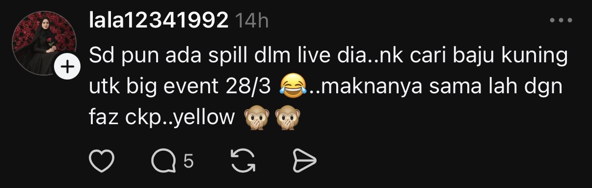 “SD (Space Dollah) pun ada spill dalam live dia, nak cari baju kuning untuk big event 28 Mac ini.