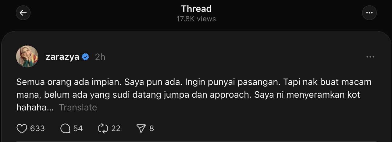 Menurut Zara atau nama lengkapnya Zainurul Razia Mohd Zainuddin, keinginan untuk mempunyai teman hidup sentiasa ada namun jodoh belum menyebelahinya setakat ini.