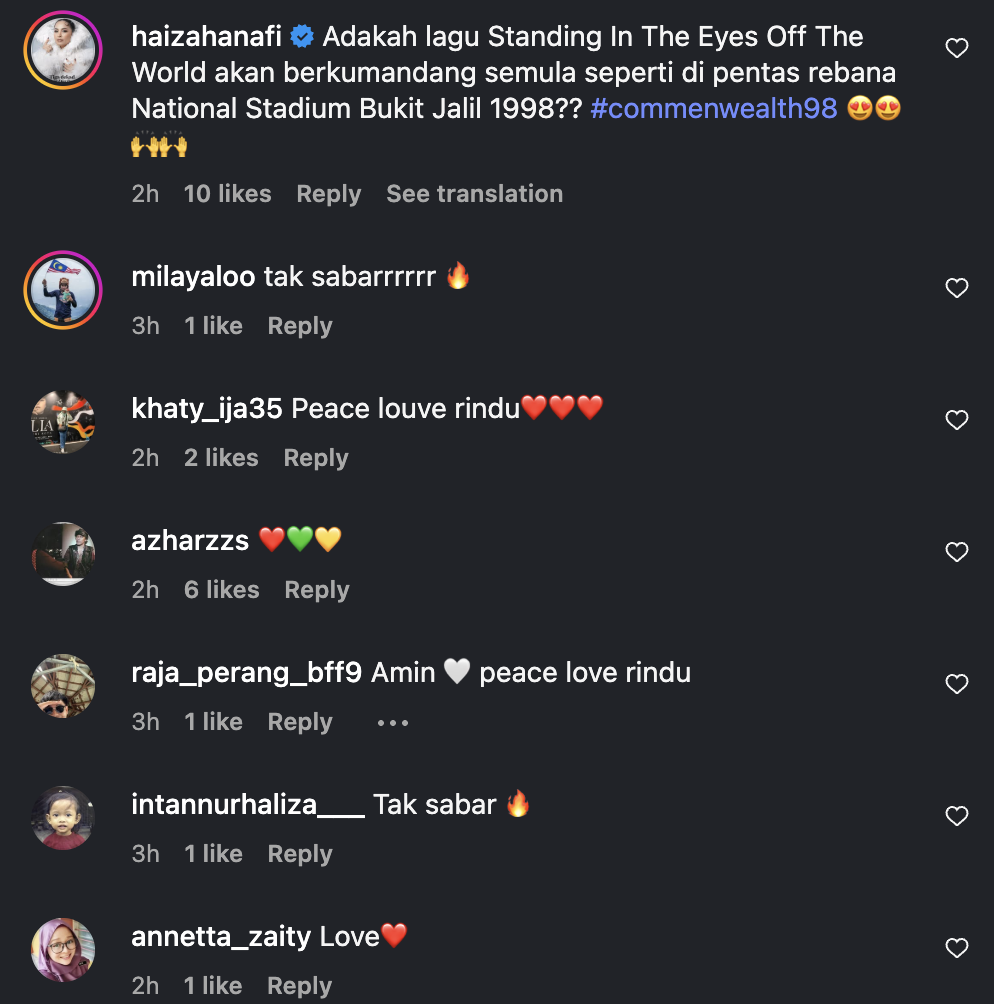 “Biar cinta, rindu, satukan kita. Bersama Ella, Stadium Nasional, destinasi anda. Cipta sejarah bersama. Peace, Love, Rindu,” katanya.