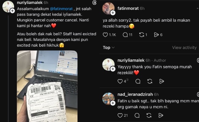 Menerusi aplikasi Threads, individu yang dikenali sebagai @nuriyliamalek memaklumkan pihak kurier dipercayai telah tersalah hantar bungkusan yang dipercayai milik seorang pelanggan yang telah membatalkan pesanan.