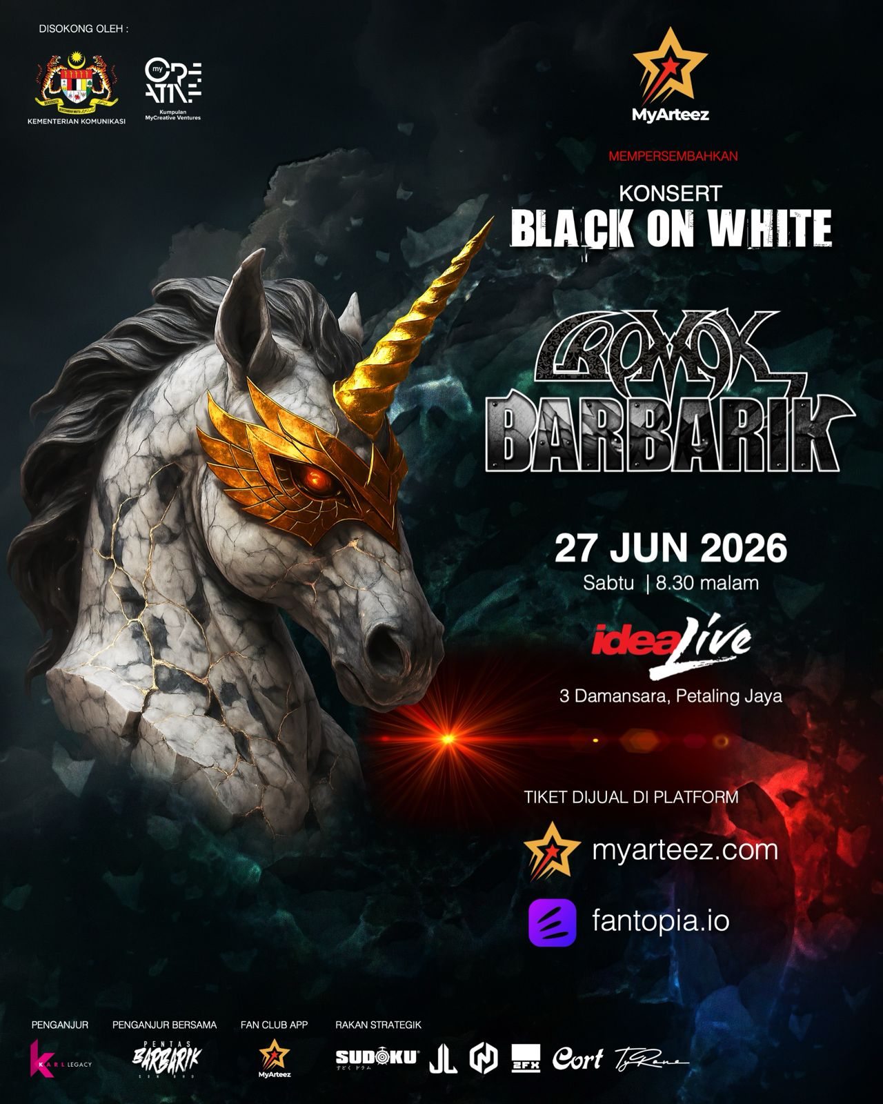 - Konsert Black On White Cromok-Barbarik akan berlangsung pada 27 Jun di IdeaLive, Petaling Jaya, menampilkan gabungan dua kumpulan rock dan metal terkenal, Cromok dan Barbarik.