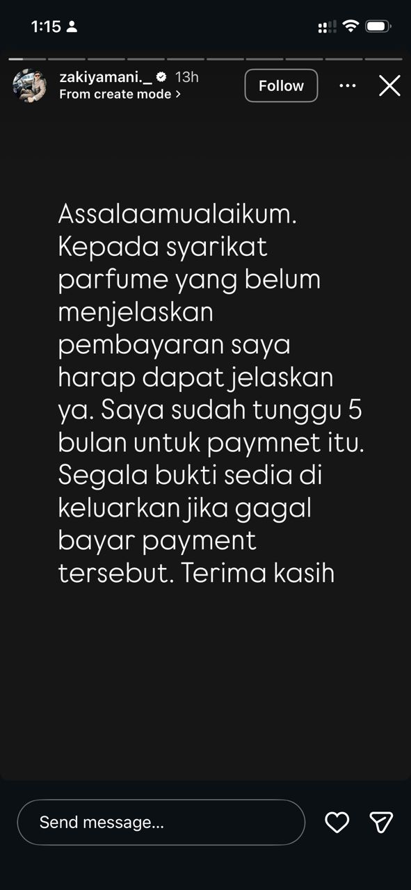 “Assalamualaikum. Kepada syarikat perfume yang belum menjelaskan pembayaran saya harap dapat jelaskan ya. Saya sudah tunggu lima bulan untuk bayaran itu,” tulisnya.