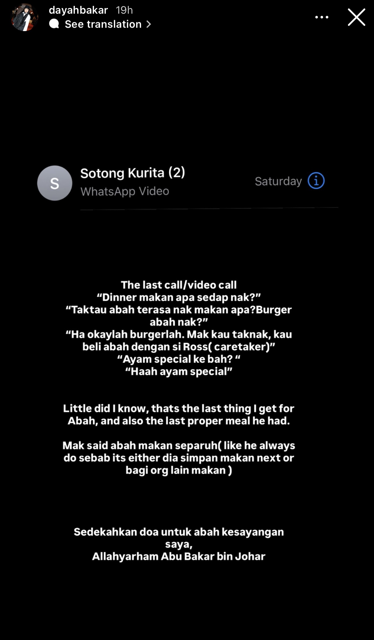 - Dayah Bakar berkongsi momen terakhir bersama arwah bapanya, Abu Bakar Johar, yang meninggal dunia pada 25 November lalu.