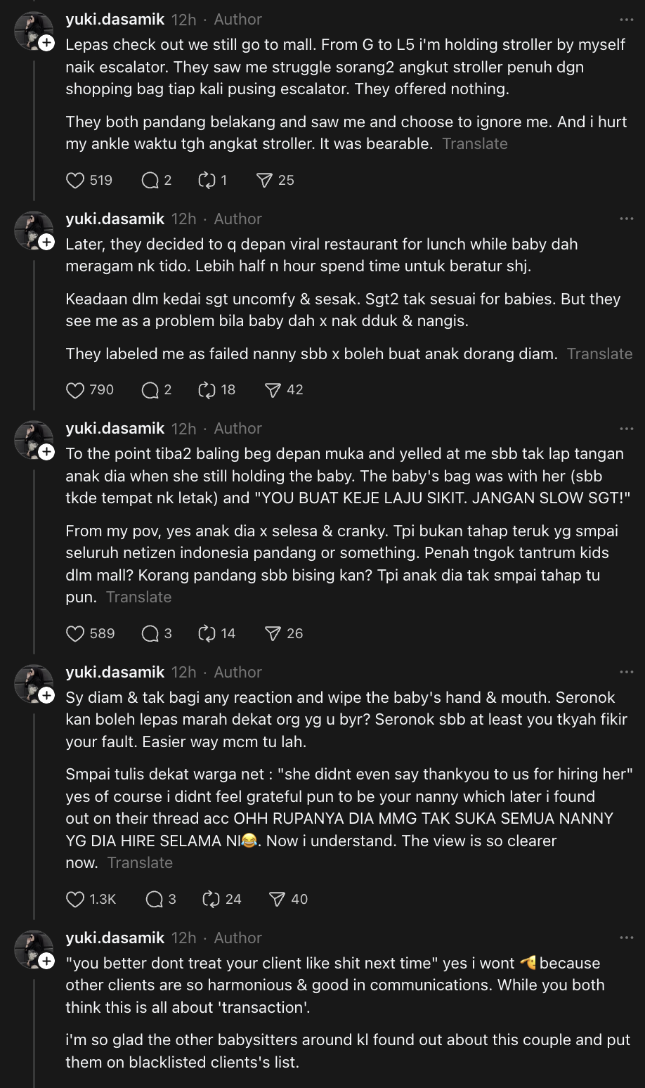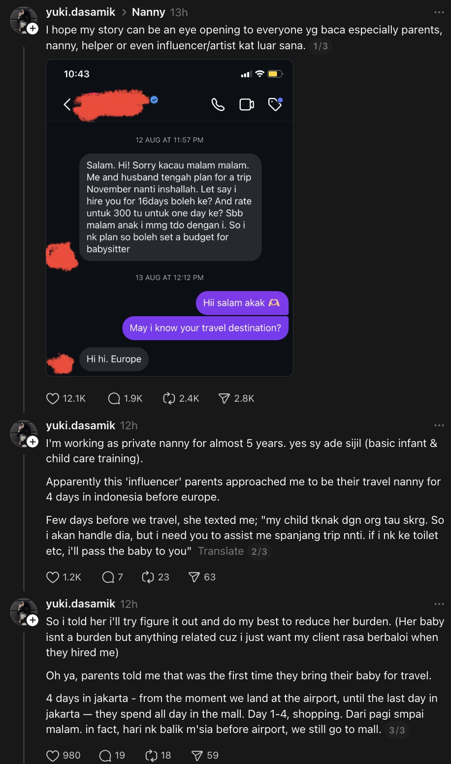 Menerusi perkongsian di platform Threads, wanita tersebut mendedahkan bahawa dia telah diupah oleh pasangan berkenaan untuk menjaga anak mereka selama beberapa hari ketika mereka bercuti di Jakarta, Indonesia.