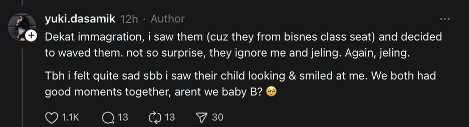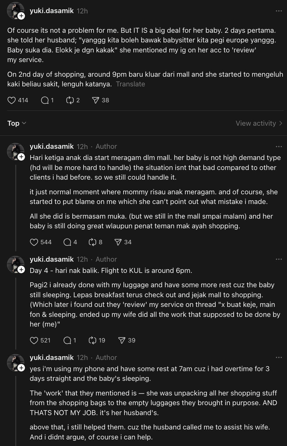 “Beberapa hari sebelum kami berlepas, si ibu menghantar mesej kepada saya:‘Anak saya sekarang tak nak dengan orang. Jadi saya akan handle dia, tapi saya perlukan awak untuk assist saya sepanjang trip nanti. Kalau saya nak ke tandas dan sebagainya, saya akan pass baby dekat awak,” tulisnya.