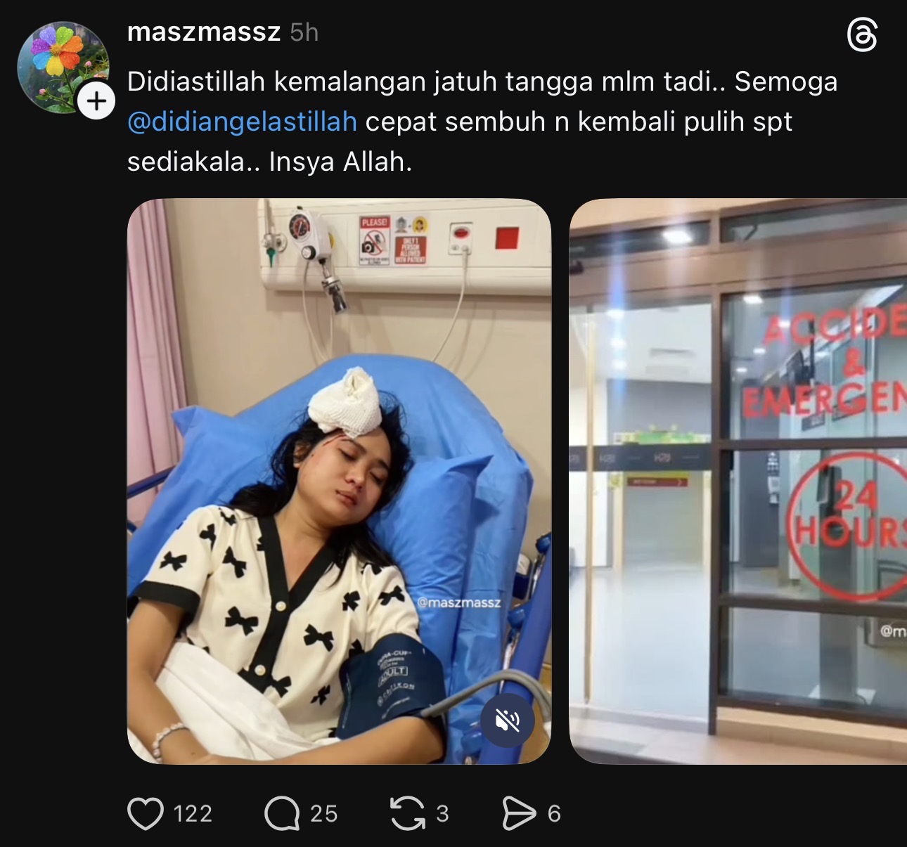 “@Didiastillah kemalangan jatuh tangga malam tadi. Semoga @didiangelastillah cepat sembuh dan kembali pulih seperti sediakala. Insya-Allah,” coretnya.