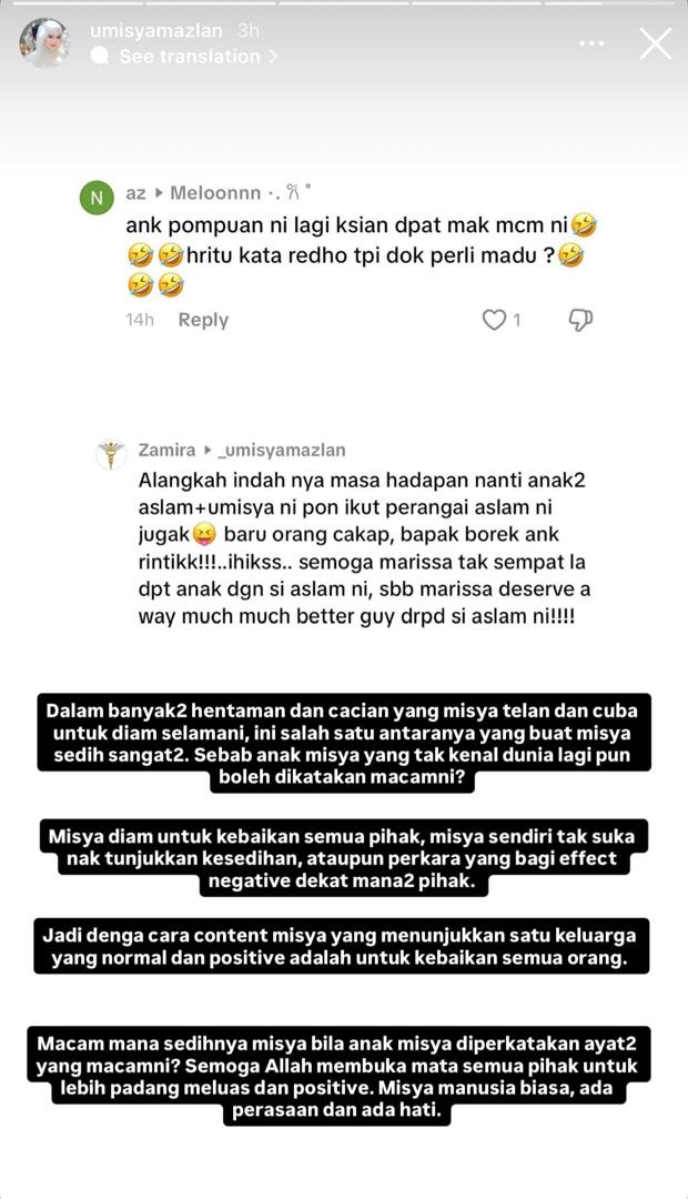 “Macam mana sedihnya Misya bila anak Misya diperkatakan ayat-ayat yang macam ni? Semoga Allah membuka mata semua pihak untuk lebih padang meluas dan positive. Misya manusia biasa, ada perasaan dan ada hati,” luahnya menerusi hantaran di Instagram Stories miliknya.