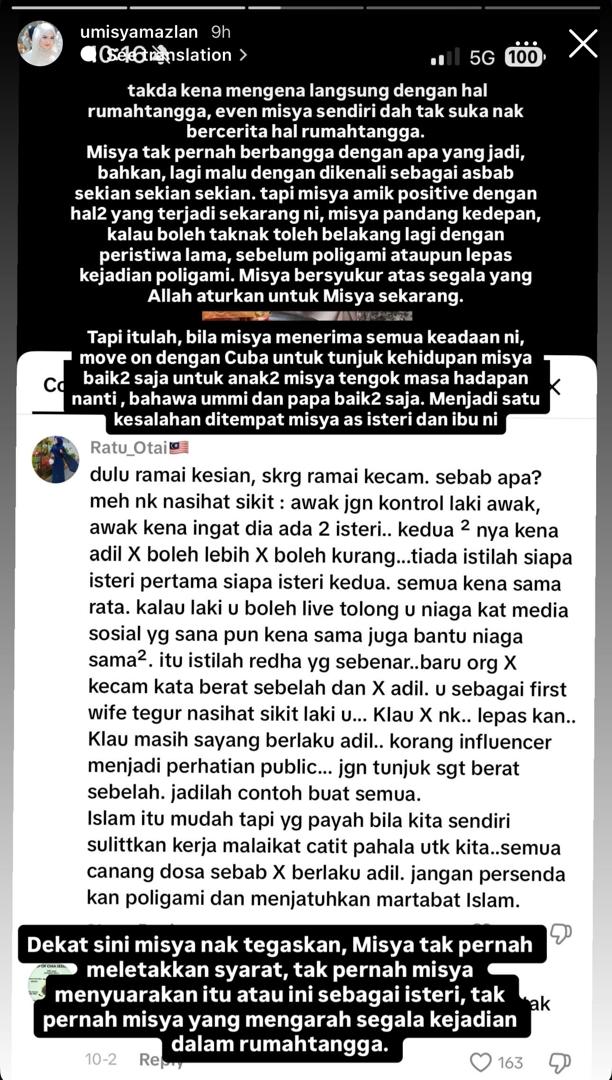 Dalam satu hantaran berlainan, Umisya juga menegaskan bahawa dia sama sekali tidak pernah campur tangan dalam yang hal berkaitan suaminya dan poligami.