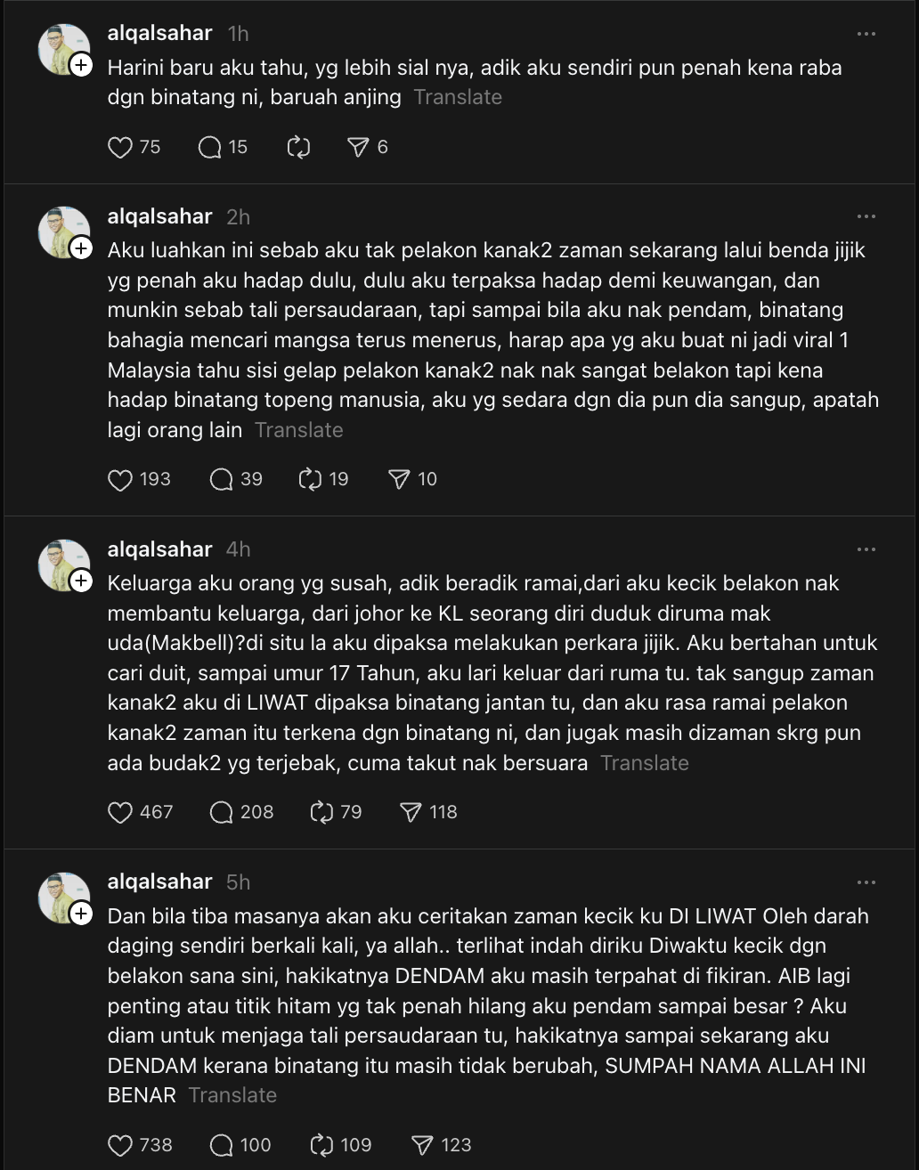 “​​Keluarga aku orang yg susah, adik beradik ramai,dari aku kecik belakon nak membantu keluarga, dari johor ke KL seorang diri duduk diruma mak uda(Makbell)?di situ la aku dipaksa melakukan perkara jijik.