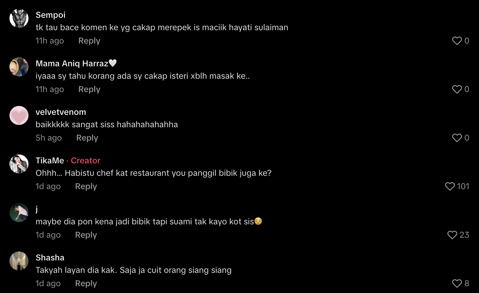 Meskipun hanya berkongsi video resepi dan penyediaan makanan, pelakon berusia 34 tahun itu tidak terlepas daripada menerima komen pedas netizen yang menyindirnya dengan gelaran ‘bibik’ meskipun sudah bergelar kepada isteri seorang jutawan.
