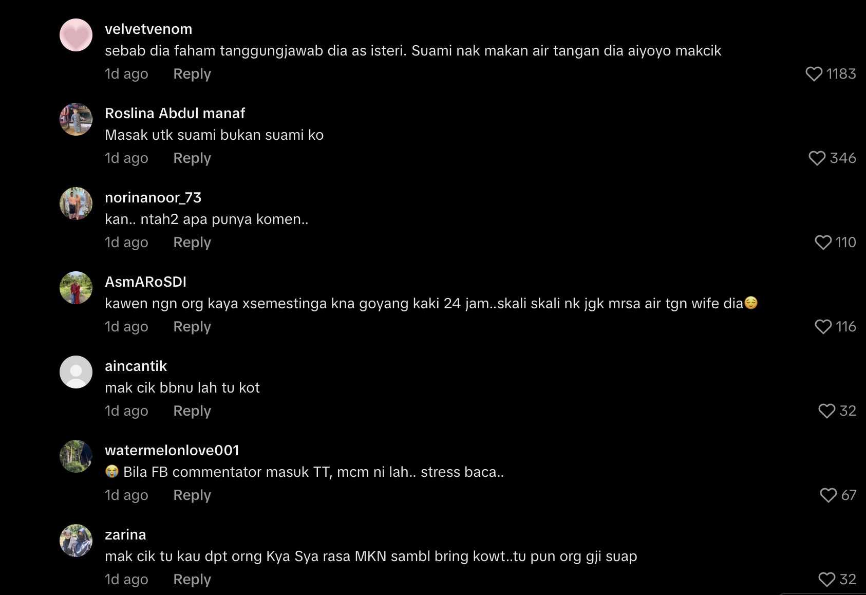 “Kahwin dengan orang kaya tapi kena masak pula macam bibik.” tulis individu tersebut.