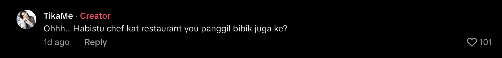 “Oh, habistu cef di restoran awak panggil bibik juga ke?” balasnya.