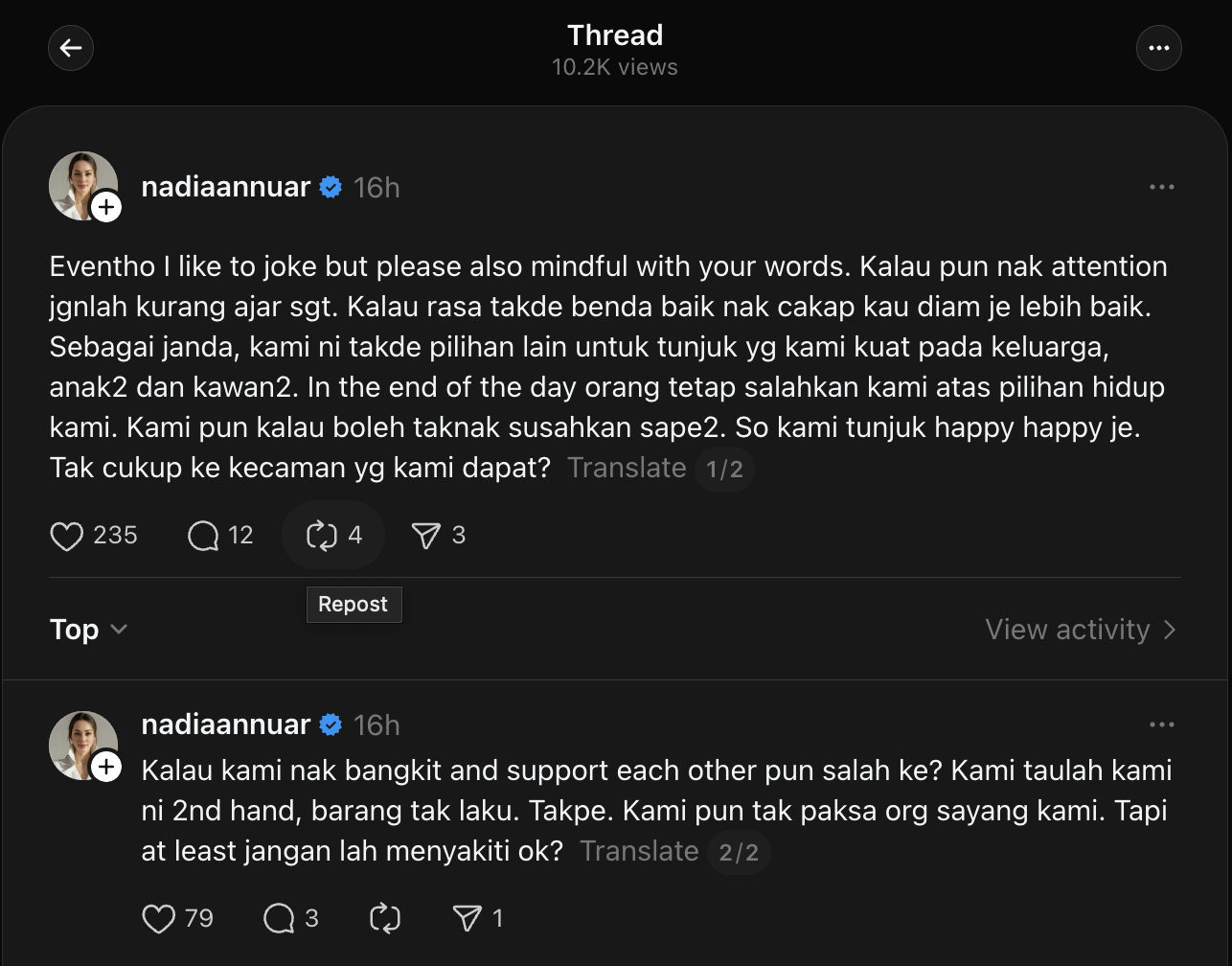 Nadia turut menjelaskan realiti yang terpaksa dihadapi oleh golongan janda yang sering disalahkan atas pilihan hidup mereka, walaupun hakikatnya mereka hanya cuba untuk terus kuat demi keluarga dan anak-anak.
