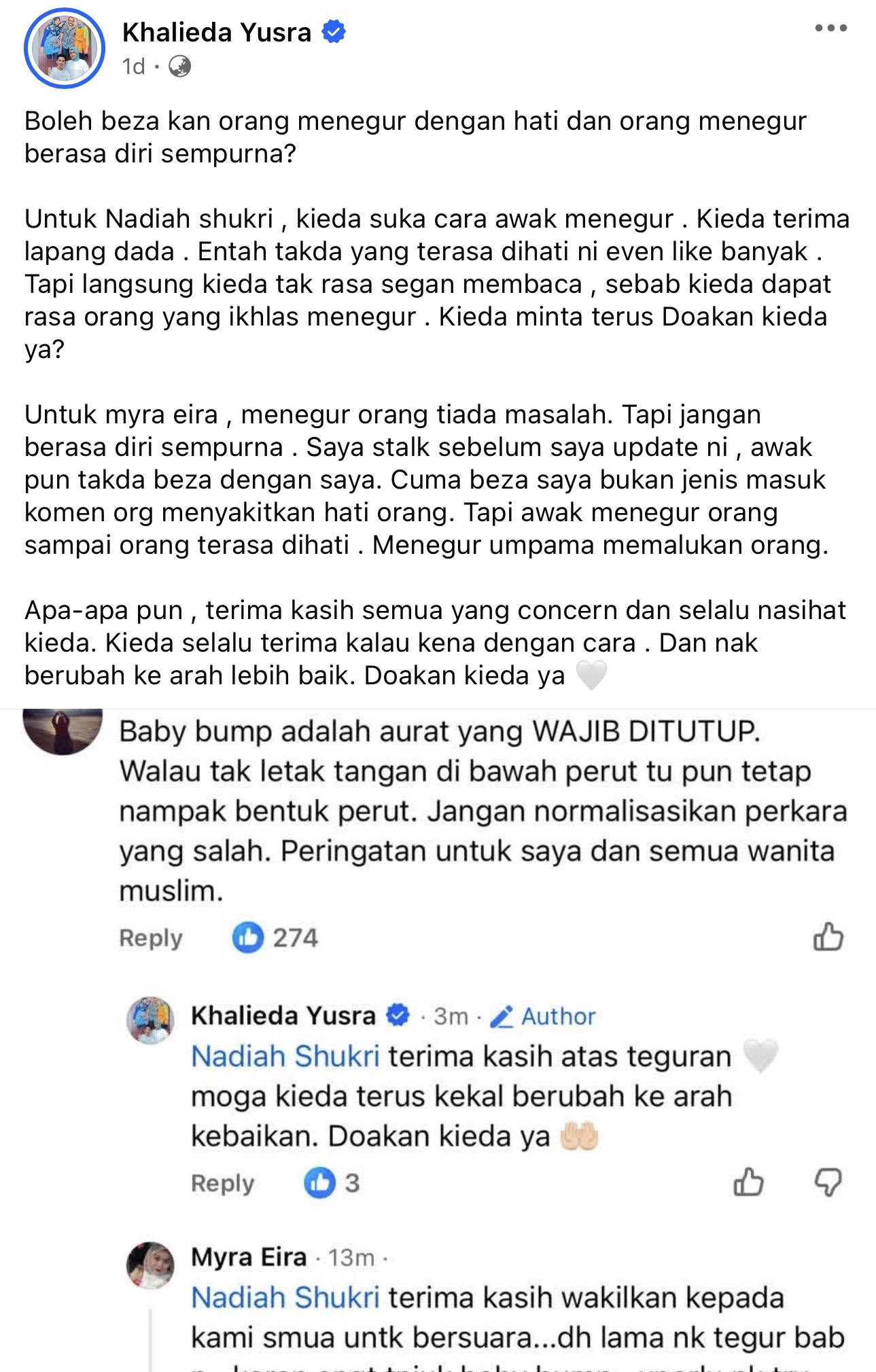 “Tapi langsung Kieda tak rasa segan membaca, sebab Kieda dapat rasa orang yang ikhlas menegur. Kieda minta terus doakan kieda ya?” coretnya.
