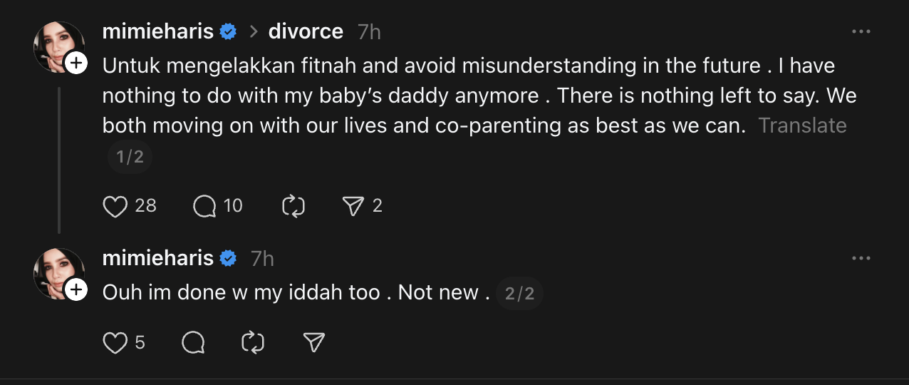 “Untuk mengelakkan fitnah dan salah faham pada masa akan datang, saya sudah tidak mempunyai apa-apa hubungan lagi dengan bapa kepada anak saya. Tiada apa lagi yang perlu diperkatakan.