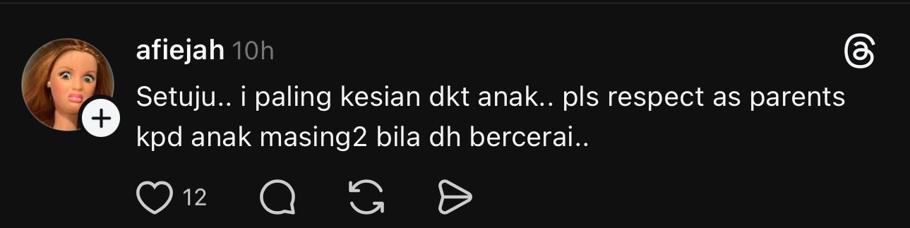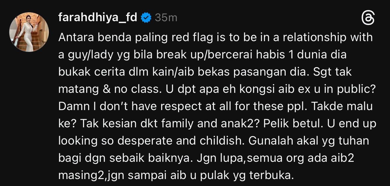 Dalam hantaran yang sama, Farahdhiya juga turut mempersoalkan sikap individu yang sanggup memalukan bekas pasangan tanpa memikirkan kesan terhadap keluarga dan anak-anak.