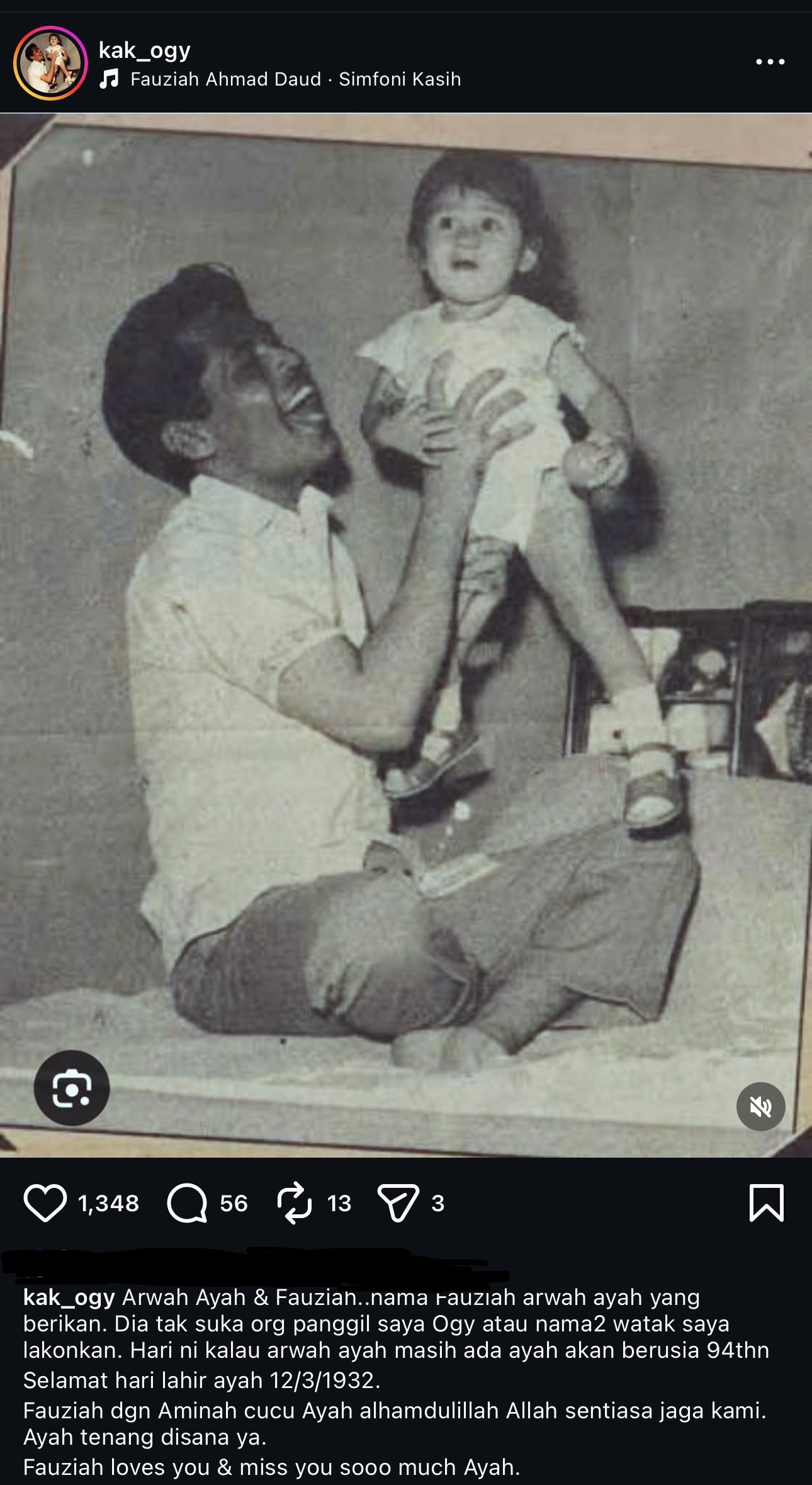 Menerusi perkongsian di Instagram, Fauziah atau lebih mesra dengan panggilan Ogy meluahkan rasa rindu terhadap bapanya, Datuk Ahmad Daud Mohamad Hashim.