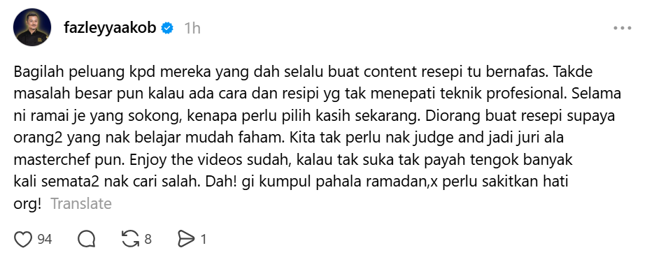 Menerusi satu hantaran di Threads, Fazley menyeru orang ramai agar memberi ruang dan peluang kepada pencipta kandungan masakan untuk terus berkarya tanpa dihujani kecaman berlebihan.