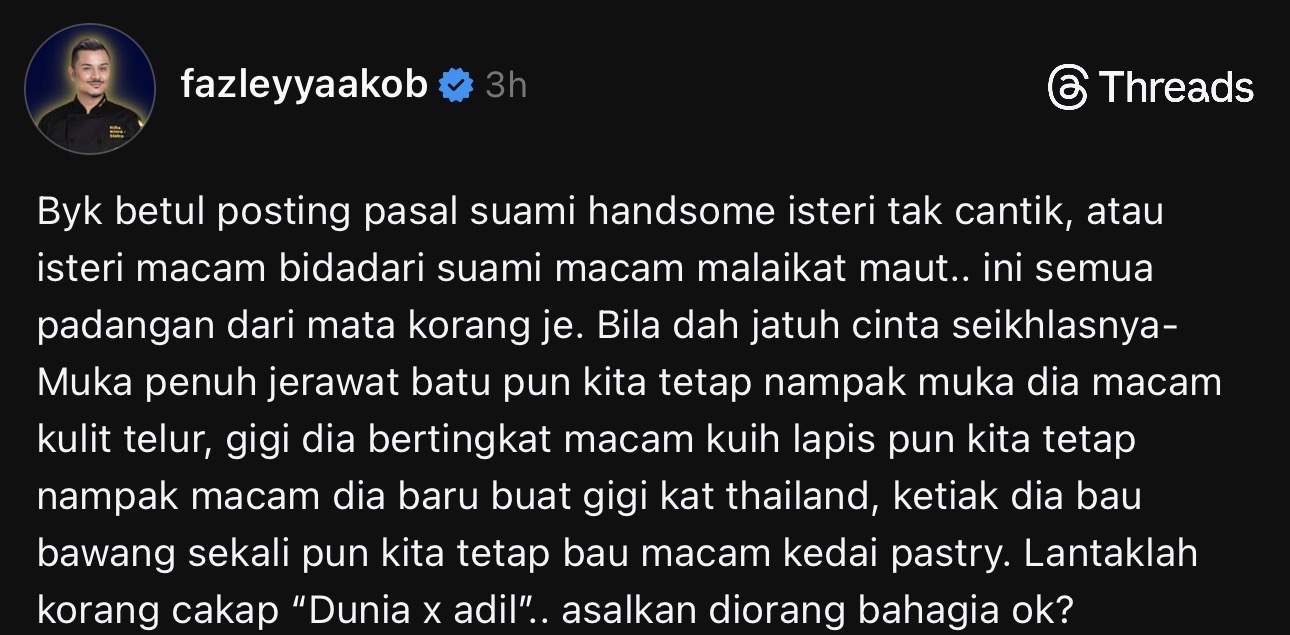 Menerusi perkongsian di platform Threads, Fazley menegur sikap membandingkan fizikal pasangan yang dilihat semakin berleluasa.