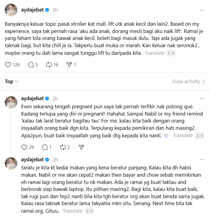 Dalam hantaran seterusnya, Ayda turut mendedahkan bahawa walaupun kini sedang hamil, dia tetap tidak pernah mengambil kesempatan untuk memotong barisan.