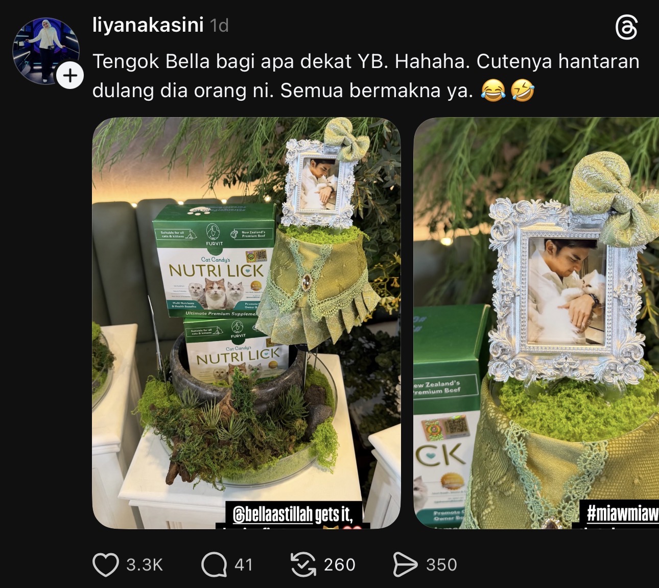 Berkonsepkan ‘Green Forest’, hantaran itu juga dilabelkan sebagai cukup unik apabila netizen menyedari terdapat sentuhan peribadi di mana Bella mengambil kira sisi peribadi Saddiq termasuklah haiwan kesayangannya iaitu kucing.