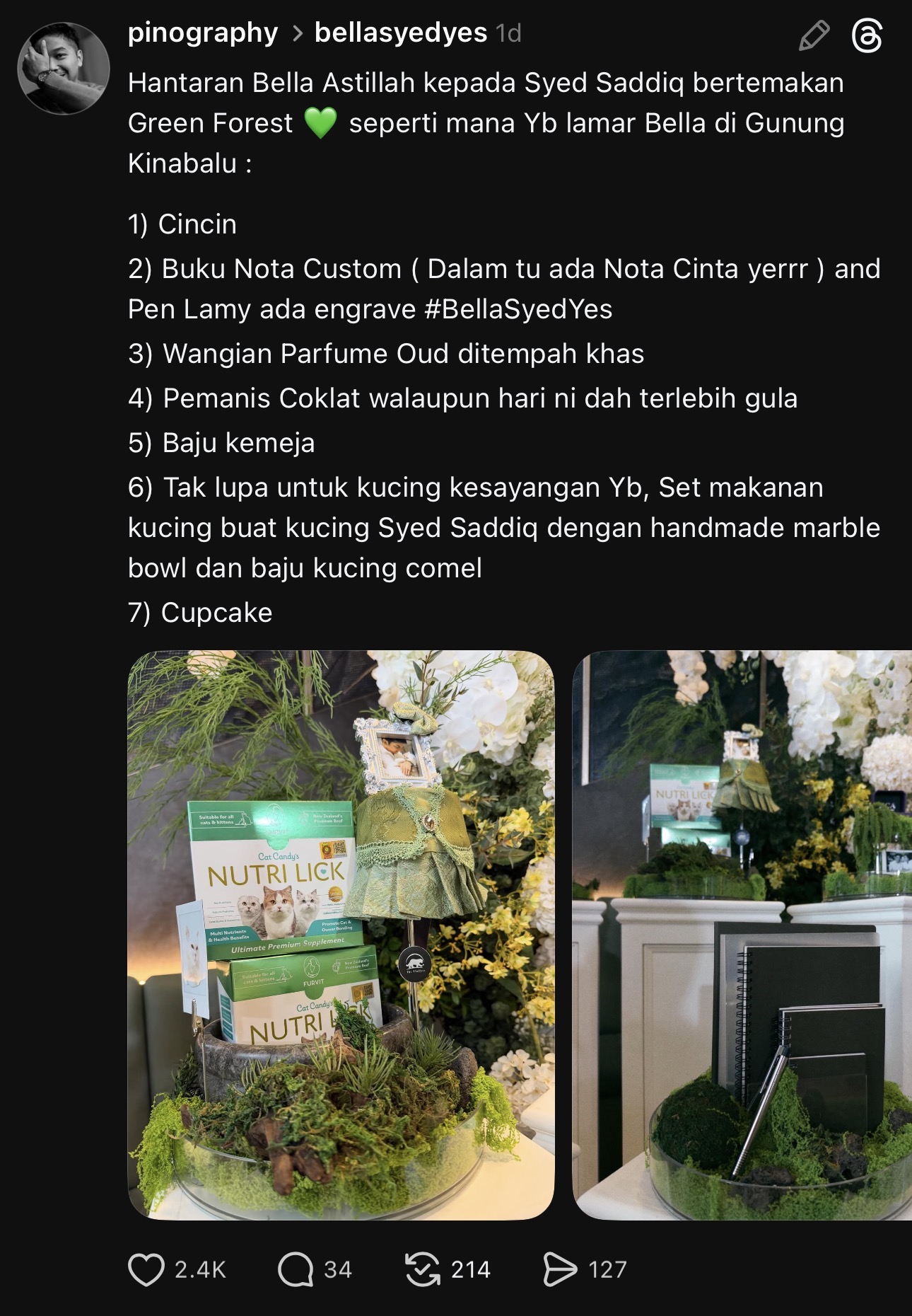 Untuk info, hantaran yang diberikan Bella adalah cincin, buku nota kostum, pen Lamy dengan ukiran nama #BellaSyedYes, wangian Parfume Oud yang ditempah khas, pemanis coklat, cupcake, baju kemeja, set makanan kucing, ‘handmade marble bowl’ dan baju kucing.